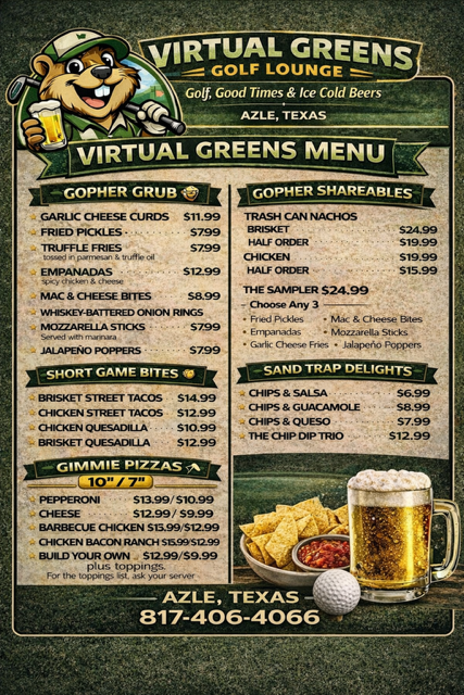 Take a swing at our delicious food and beverage items. We have a full-service bar including mixed drinks, draft beer, seltzers, wine and more. This will be a perfect compliment to your Virtual Golf experience.